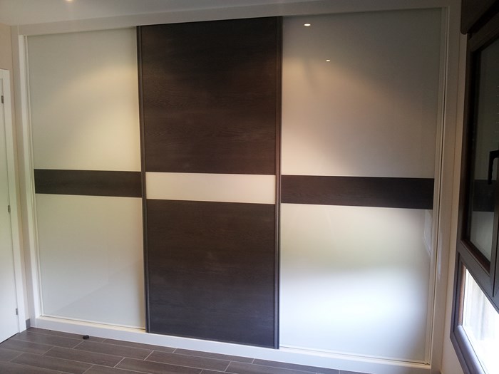Descripción : TRES HOJAS EN SISTEMA CORREDERA, ROBLE TINTADO DECAPÉ, CON BETA HORIZONTAL, A JUEGO CON VIDRIO DECORATÃVO DE COLOR Y PERFILERÃA EN ALUMINIO MATE...
