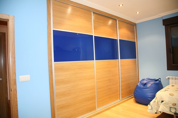Descripción : FRONTAL CORREDERA DE TRES HOJAS, COMBINADO ROBLE BARNIZADO CON BETA EN HORIZONTAL, VIDRIO DECORATÃVO DE COLOR Y PERFILERÃA EN ALUMINIO PLATA MATE...
