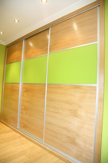 Descripción : FRONTAL CORREDERA EN ROBLE BARNIZADO COMBINADO CON VIDRIO DECORATIVO DE COLOR... A JUEGO CON PERFILERÃA EN ALUMINIO PLATA MATE...