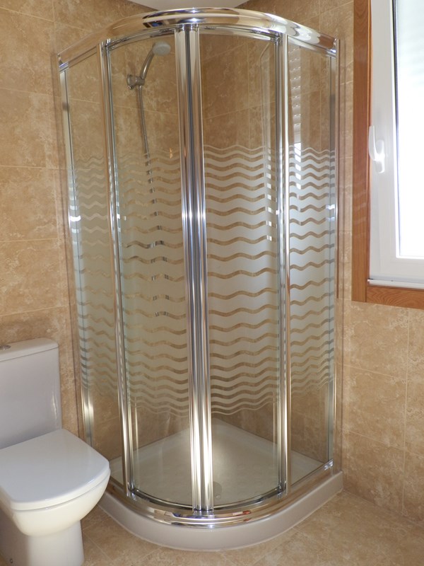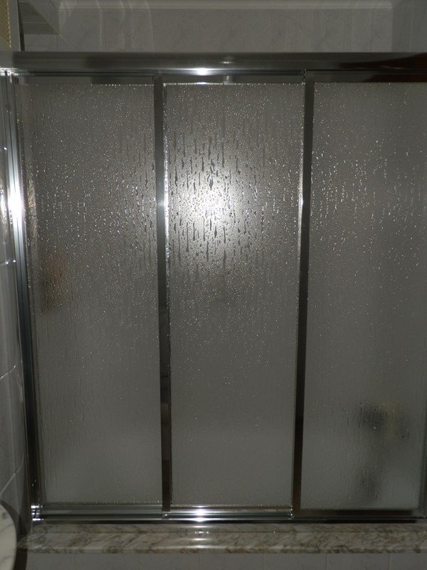 Descripción : FRONTAL DE MAMPARA DE DUCHA, TRES HOJAS CORREDERA, INSTALADA EN BAÑO CON PARED RÚSTICA, DONDE ES MUY IMPORTANTE UN PERFECTO ACABADO...