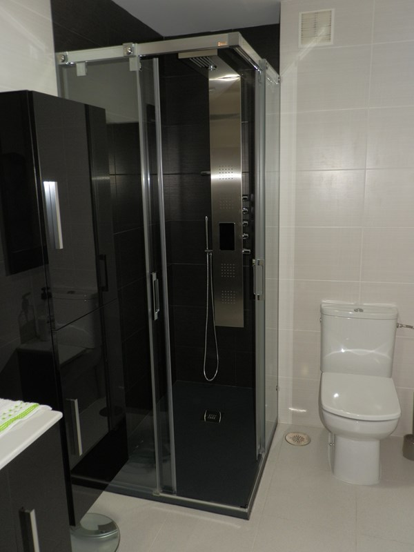 Descripción : FIJO LATERAL DE MAMPARA DE DUCHA DE OBRA, EN ESTE CASO PERSONALIZADA Y EXCLUSIVA, FABRICADA A MEDIDA EN VIDRIO NEGRO...